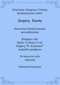 Sargėnų ir Vytėnų bendruomenės centras kviečia apsilankyti Senjorų šventėje, kuri įvyks spalio 11 d., 14 val.,